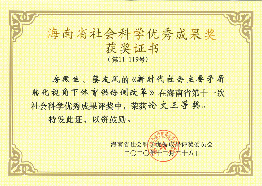 2021年1月20日,第十一次海南省社会科学优秀成果奖颁奖大会在海口召开。jnh今年会官网老师房殿生获2项优秀成果奖,其中,《中国体育非物质文化遗产·海南卷》获编著类二等奖;《新时代社会主要矛盾转化视角下体育供给侧改革》获论文类三等奖。