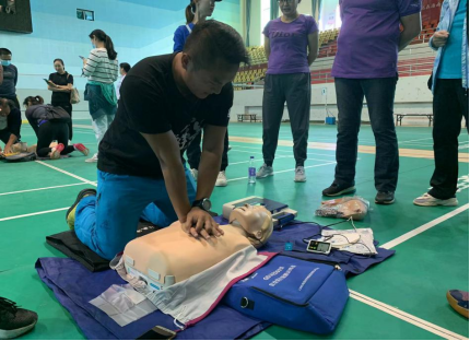 在专业技术人员的指导下,教师们利用模拟人进行心肺复苏演练。从发现患者、拨打急救电话、托人寻找AED到胸腔按压、人工呼吸和AED使用等,各个流程步骤的操作须细致且及时,教师们专注认真,切身体验了一次“和时间赛跑”的全过程。